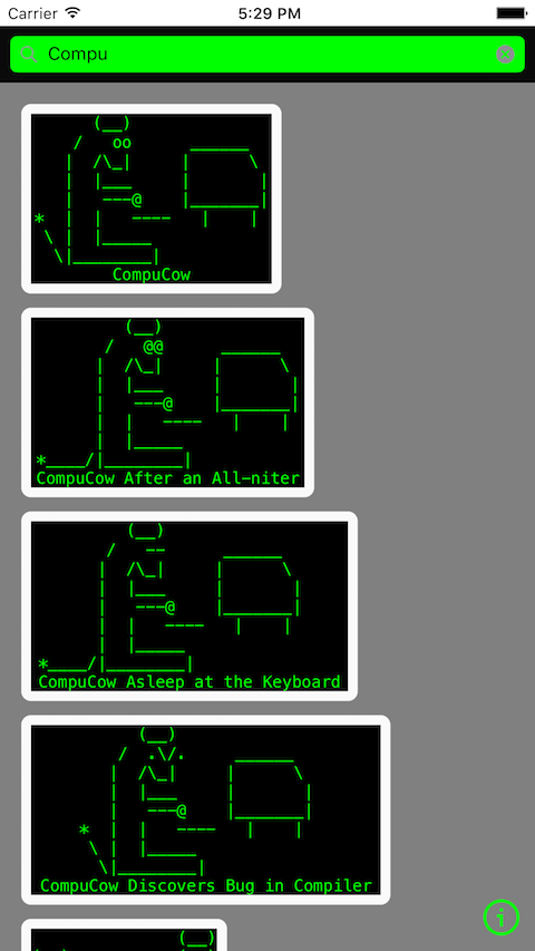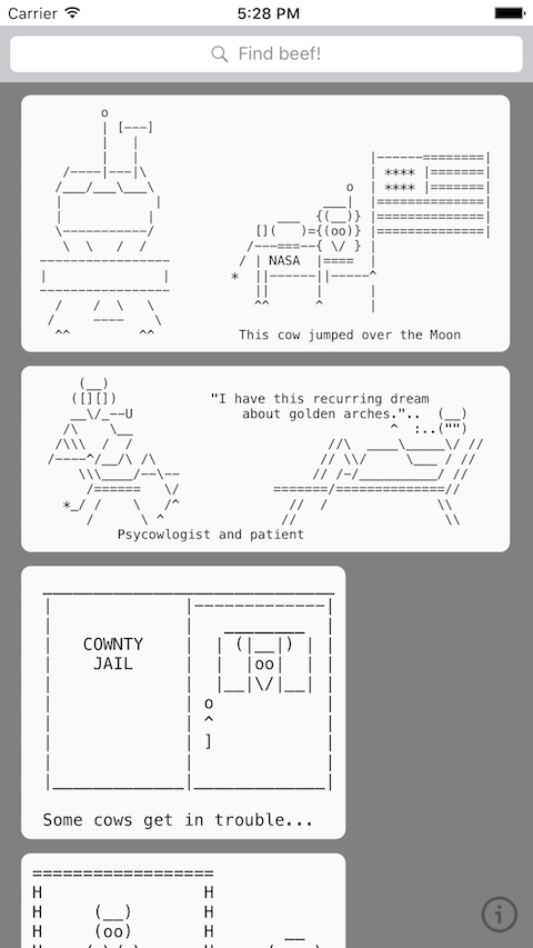 ASCII Cows is a native iOS application written in Swift 3...5. Pretty much all the UI setup is done in code for various reasons.