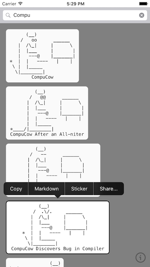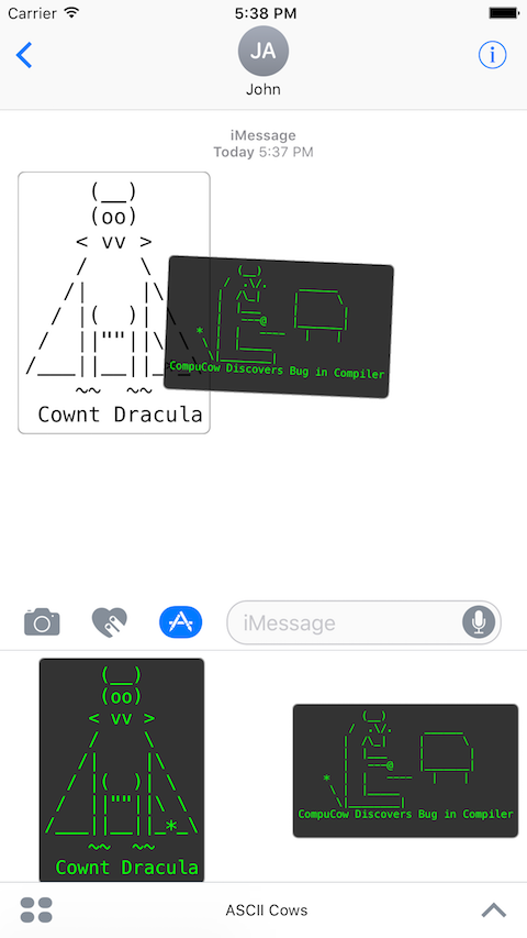 ASCII Cows also includes a Messages app extension (iOS 10+ only). Use it to create a list of your favorite Cow stickers.