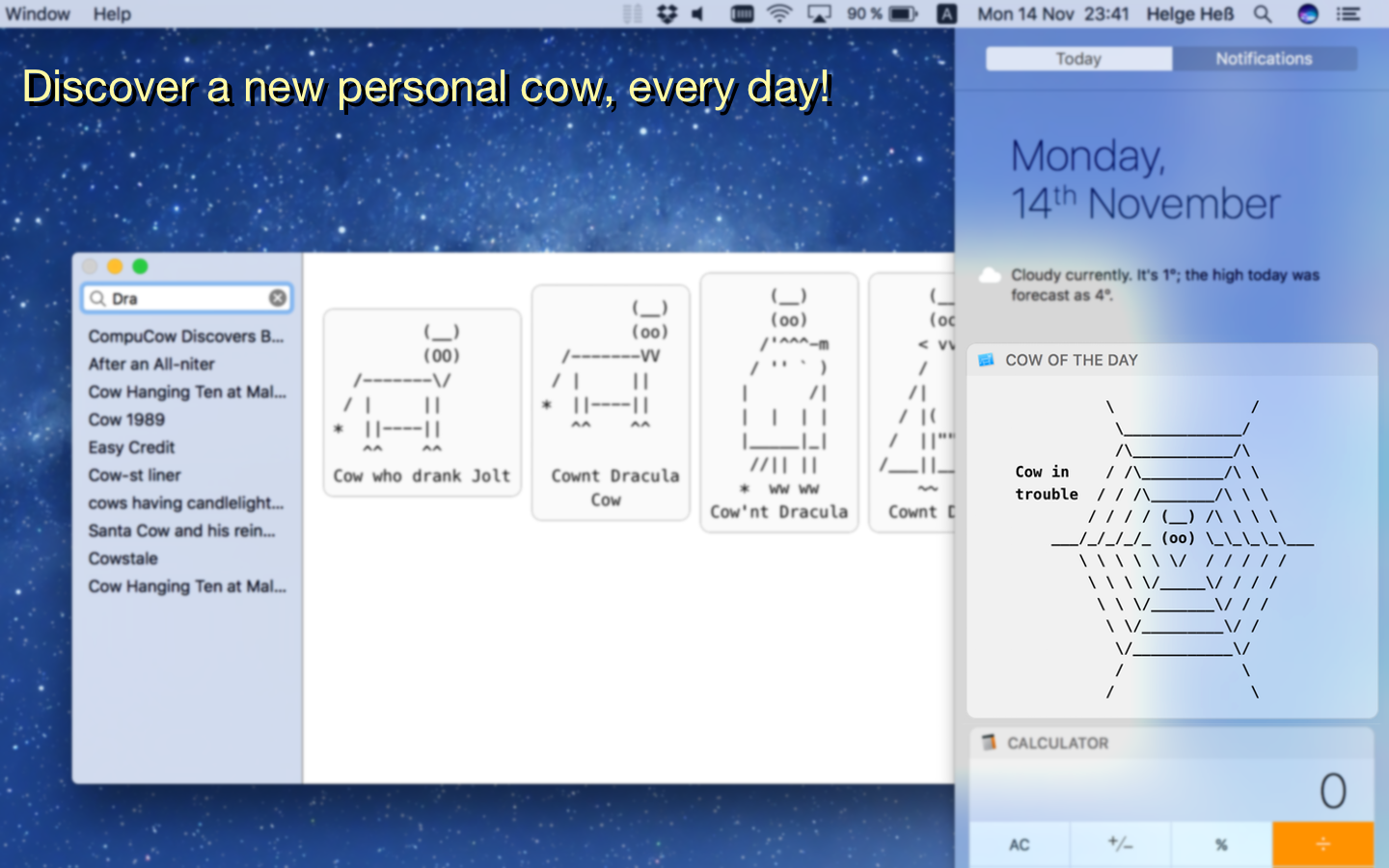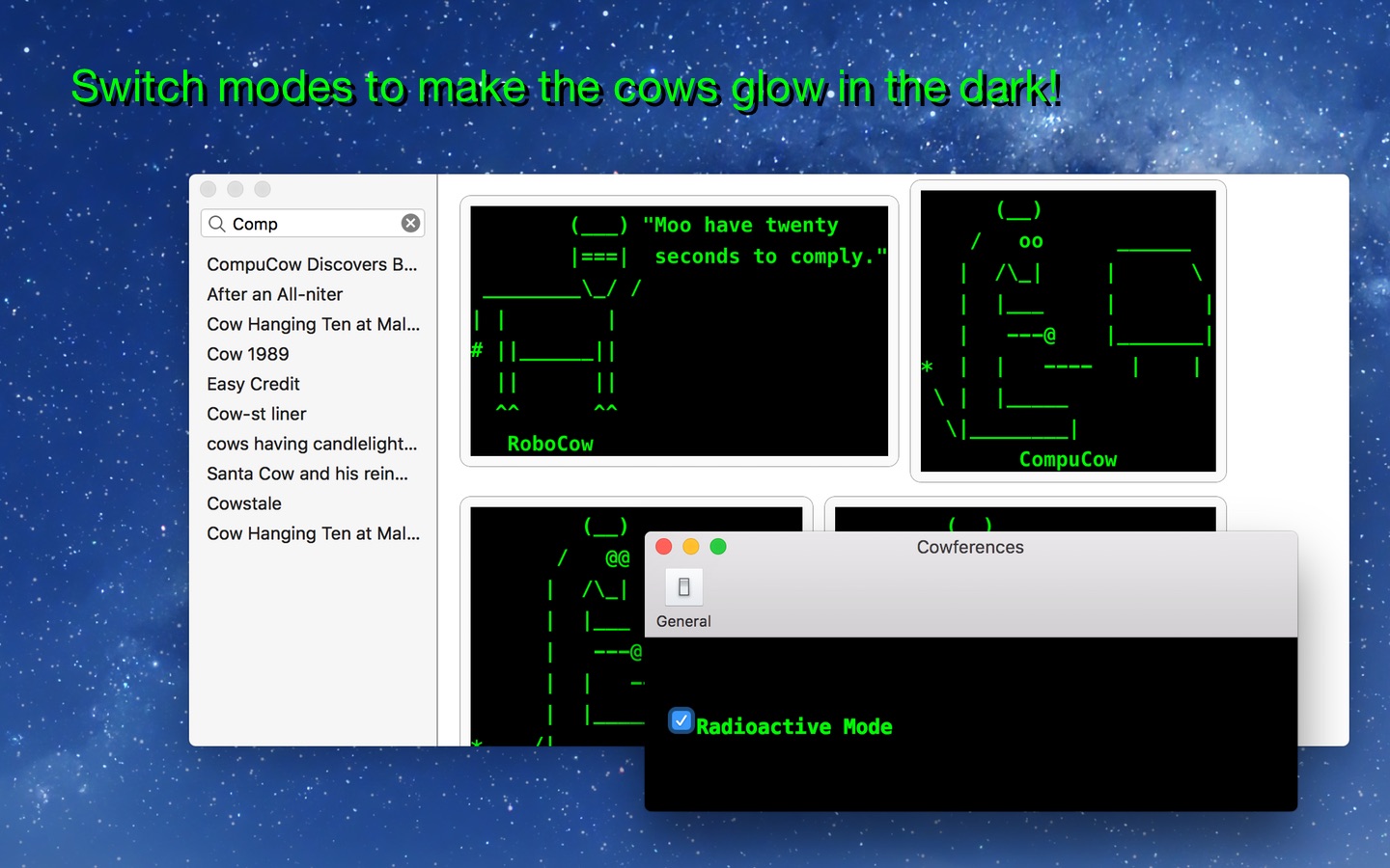 Other extras include a “Cow of the Day” widget for the macOS Notification Center, and broad copy&paste and drag&drop support (drag cows to the Finder, or into Preview, etc). Plus a beautiful “Radiactive” mode which makes the cows glow in the dark.