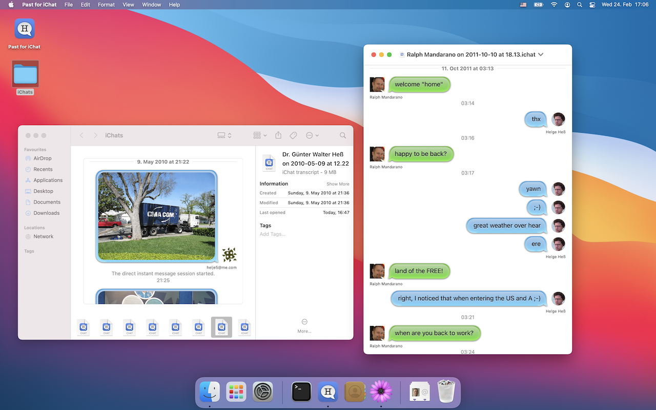 The Past for iChat is a small macOS Big Sur application to open old iChat logs (.chat and .ichat files). Interested in letting us write an app for you? Contact us!